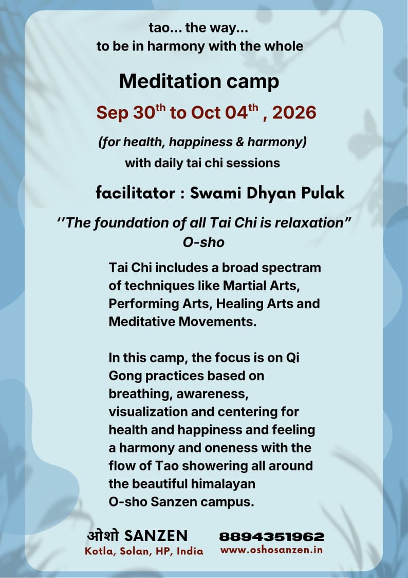 In this camp, the focus is on Qi Gong practices based on breathing, awareness, visualization and centring for health and happiness and feeling a harmony and oneness with the flow of tao showering all around the beautiful himalyan O-SHO SANZEN campus...