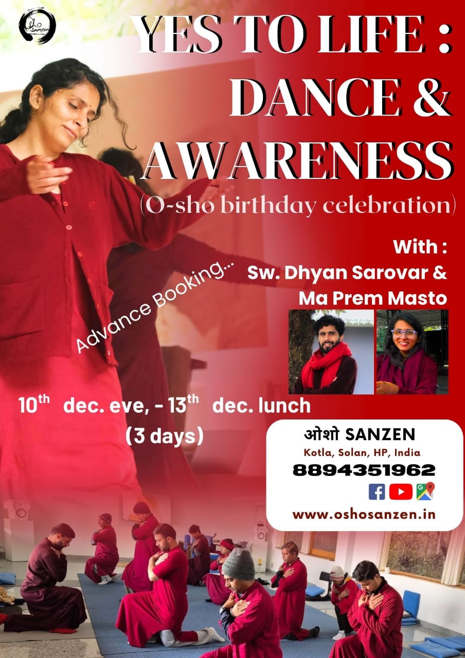 A meditation program being conducted on O-sho Birthday Celebration in December at O-sho Sanzen, Solan. Rooted in O-sho’s vision of celebrating life as it is, the program combines dance, Gurdjieff movements, silence, and awareness practices to reconnect with our natural flow of energy and joy.